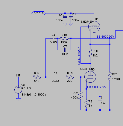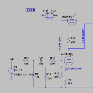 いろいろ悩んでいても始まらないので、LTSpiceで6N24Pでの回路の球を置き換え、THDの値が低くなるように定数値を変更してみる。